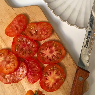 牛油果番茄鸡蛋全麦三明治用料全麦土司片 2片鸡蛋 2个番茄 1个牛油果 1个低脂芝士片 1片牛油果番茄鸡蛋全麦三明治的做法步骤1、西红柿一个,我的比较小就用了两个。